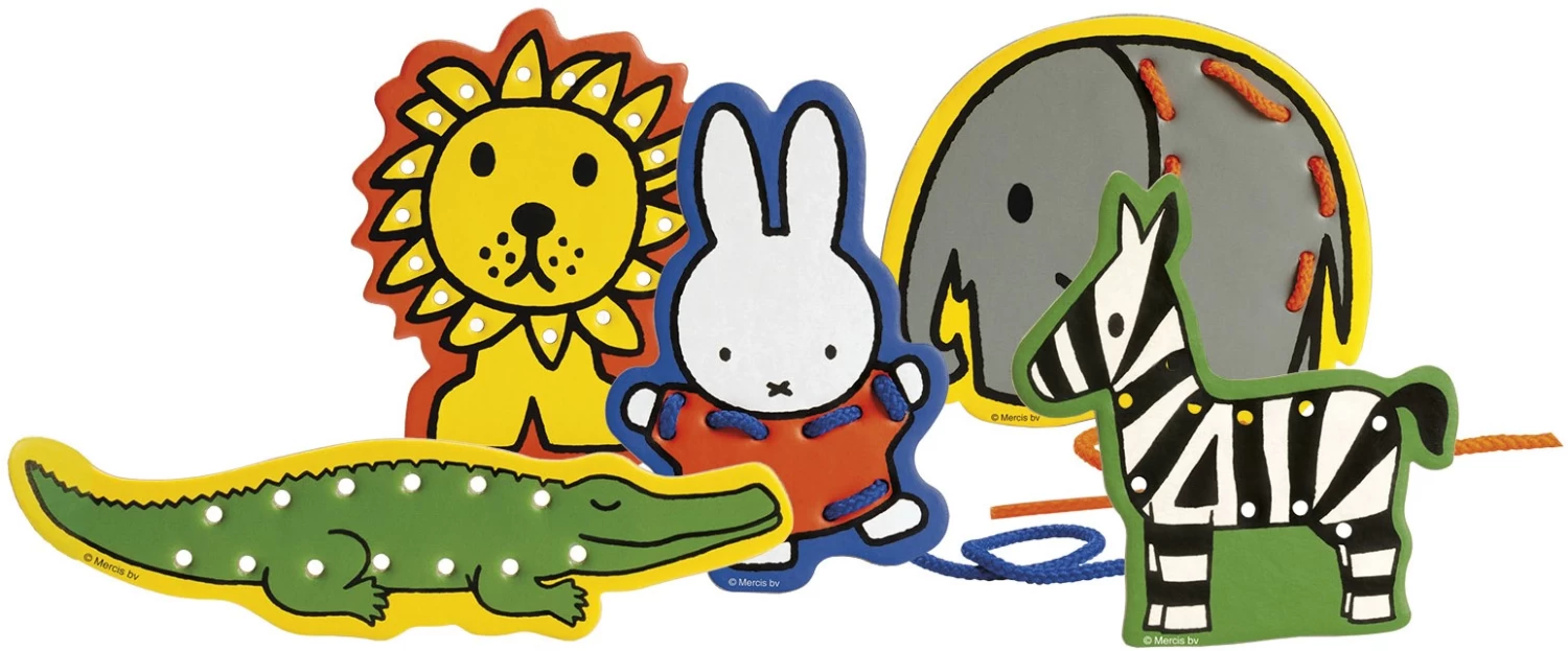 Rijg een eindje met nijntje. Leer rijgen met deze kartonnen rijgfiguren van nijntje, een krokodil, een zebra, een leeuw en een olifant.