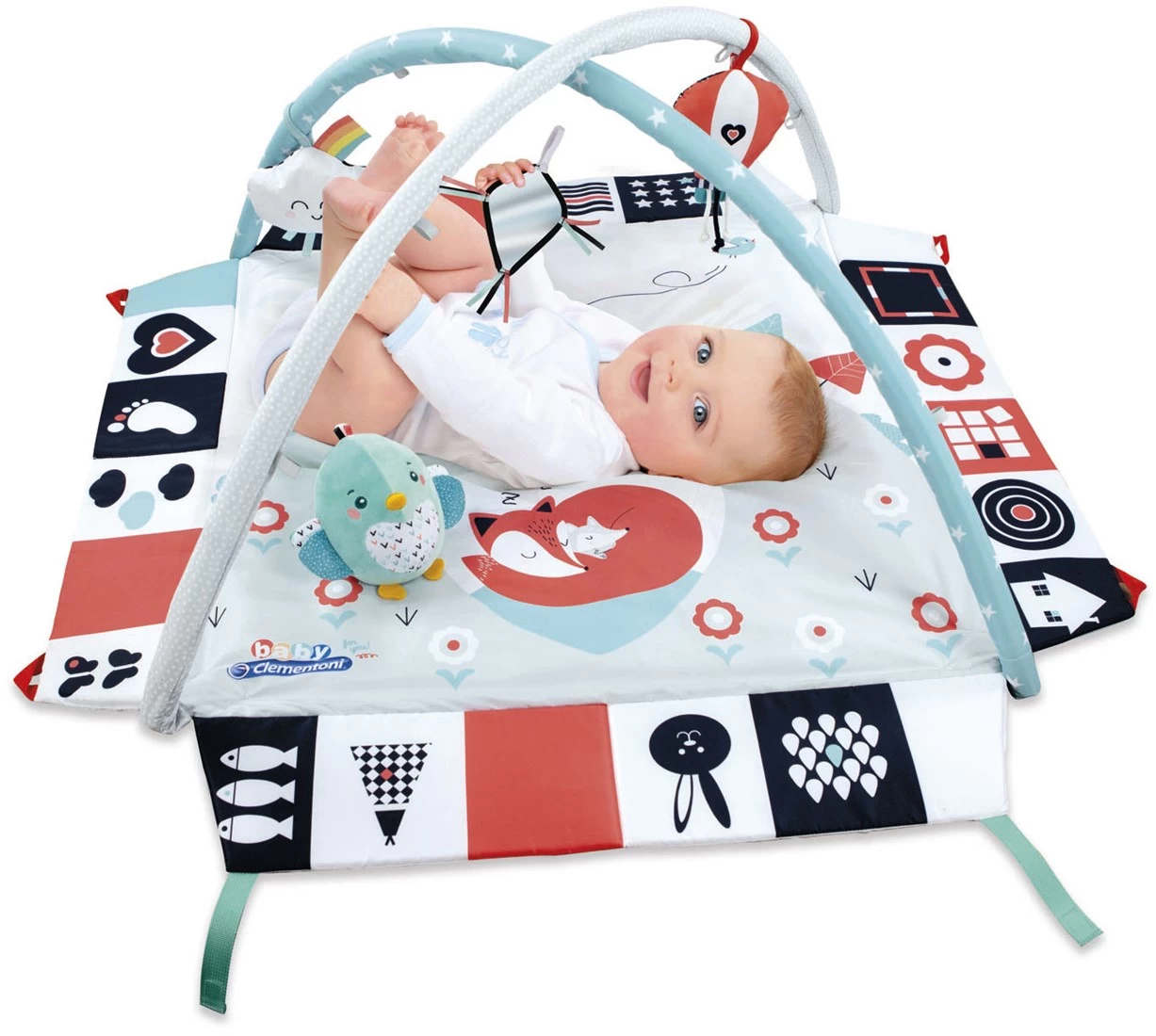 De zachte babygym is speciaal ontworpen met contrasterende witte en zwarte kleuren om de visuele ontwikkeling tijdens de eerste maanden van het kind te stimuleren. Bevat 4 ophangaccessoires die zijn ontworpen om sensorische verkenning te bevorderen: een kreuk, een piep en een rammelaar stimuleren het horen en aanraken en amuseren de baby door zijn aandacht te trekken. De randen van de sportschool kunnen worden verhoogd om het kind in alle veiligheid te laten spelen. De zijkanten zijn versierd met contrasterende pictogrammen om de blik van het kind aan te trekken om hen te volgen.