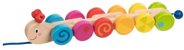 Goki ZT Raupe. Selten kam eine Raupe aus Massivholz so farbenfroh daher. Die sich ineinanderschiebenden Glieder verleihen ihr einen unverwechselbaren Gang. Der Clou sind die unterschiedlich gestalteten aufeinander abgestimmten Räder, die den Lauf der Raupe mit einem farbenfrohen Farbspiel begleiten. Doch damit nicht genug: Die einzelnen Glieder lassen sich zu einer Pyramide stapeln und die Raupe lässt sich weiterhin uneingeschränkt weiterziehen. Kein Rad stellt seine Funktion ein – absolut effektvoll.