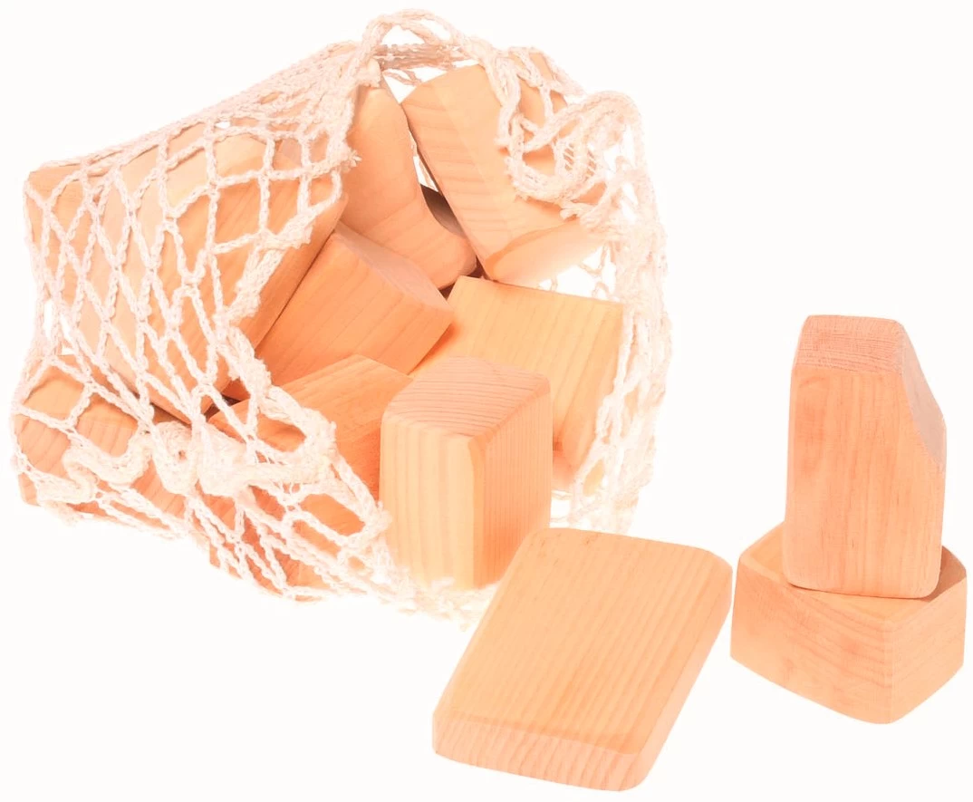 Durch die unregelmäßige Form unserer Bauklötze werden der Fantasie der Kinder keine Grenzen gesetzt und die Kreativität spielerisch gefördert. Ob als Auto, Schiff, Bügeleisen oder um eine Landschaft zu bauen, die Form der Hölzer läßt alles offen. Durch die weiche Oberfläche und ihre Größe gelingen schon den Kleinsten erste Stapelversuche. Und mit dem Baumwoll-Netz ist schnell alles aufgeräumt.