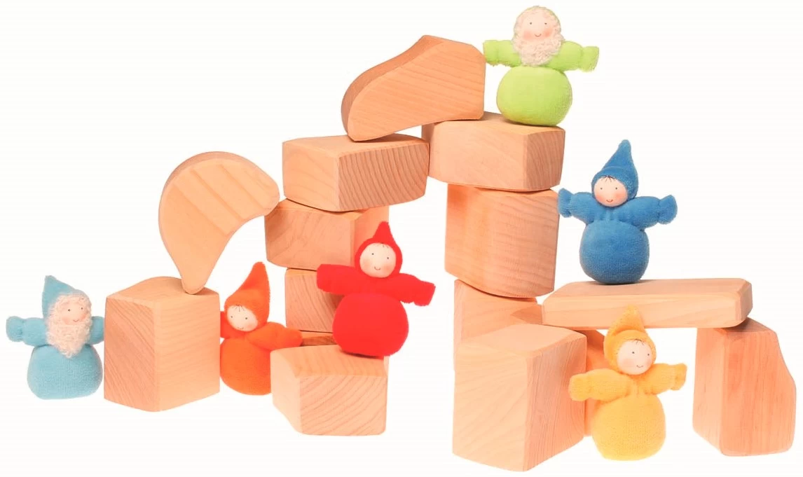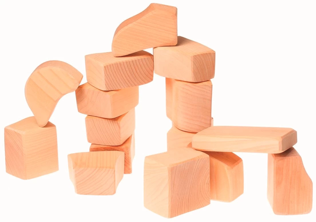 Jeder Bauklotz ist einzigartig in seiner Form. Größen und Formen können von Set zu Set variieren. Die Bauklötze werden einzeln von Hand geschliffen und sind daher frei von scharfen Ecken und Kanten.
