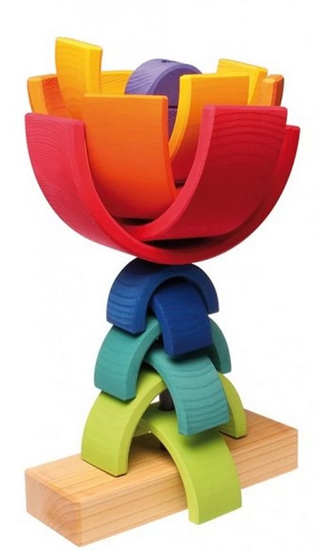 Der Regenbogen Steckturm ist ein vielseitiges Spielzeug: es können Farben, Formen und Größen sortiert, kann gestapelt und gebaut werden. So wird die Motorik der Kleinen geschult. Später können die Bögen auch als Tunnel, Dach, Turm oder Zaun dienen und auf dem Steckdübel können neue Formen gefunden und Skulpturen gesteckt werden. Schauen Sie zu, wie Ihr Kind immer neue Formen findet damit zu spielen!
