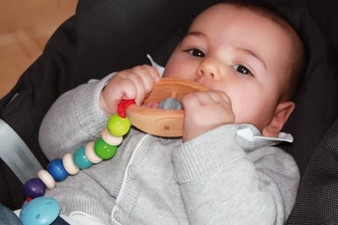 Rassel mit Rosenquarz-Perle. Diese Rassel spielt mit dem sinnlichen Kontrast zwischen warmem Holz und kaltem Halbedelstein.