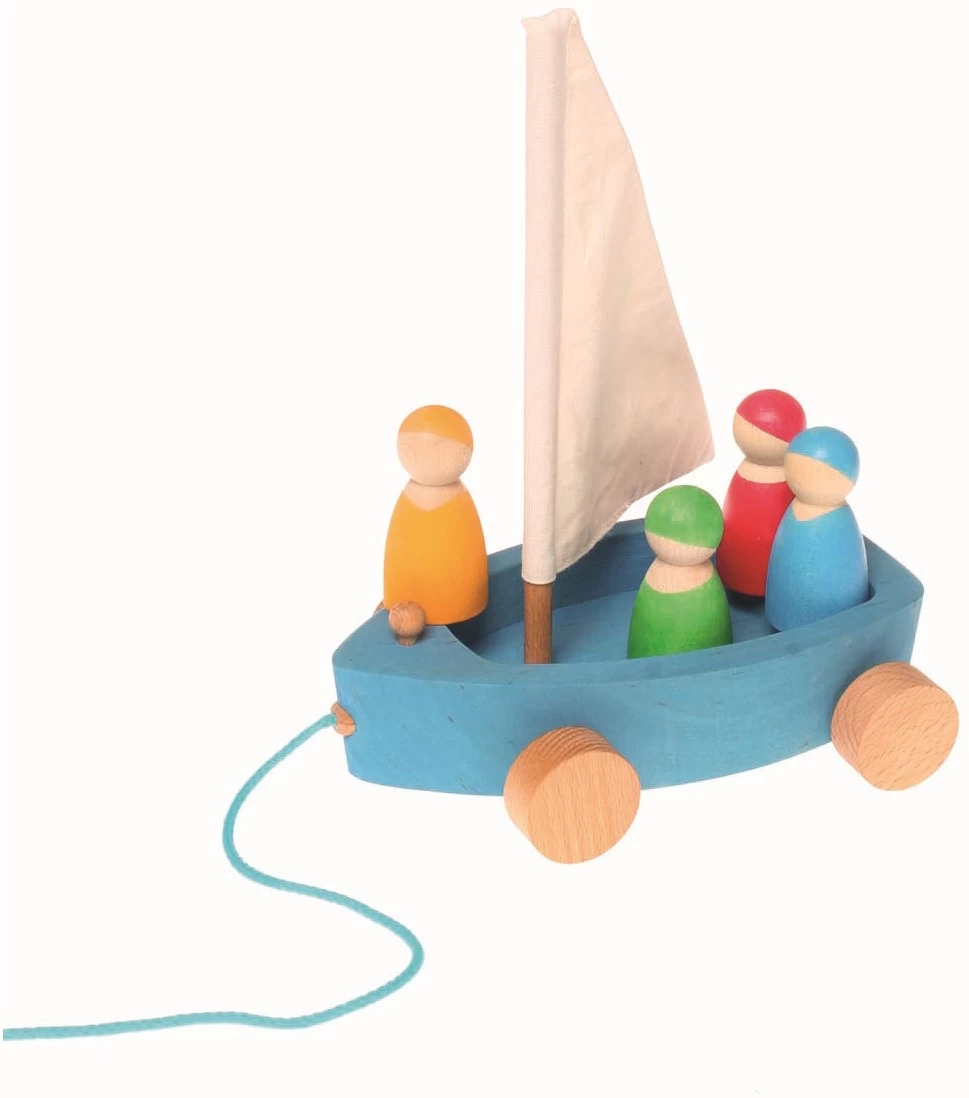 Der Strandsegler ist zum Nachziehen, und hat gleich eine ganze Mannschaft von vier Holzmännchen an Bord.