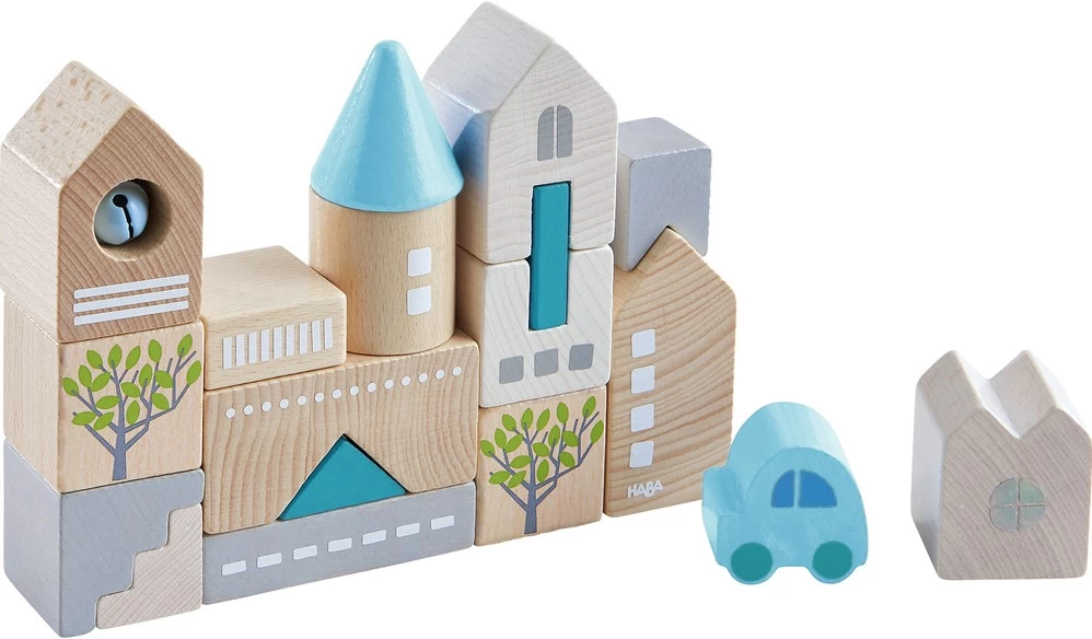 HABA Bausteine Bad Rodach. Schon immer befindet sich der HABA Firmensitz im oberfränkischen Bad Rodach. Mit diesem Baustein-Set lässt sich die Stadtkulisse nun wunderbar nachbauen. Mit verschiedenen Türmchen, Dächern oder Treppensteinen können Baumeister immer wieder neue Bau-Varianten errichten. Ganz nebenbei wird das dreidimensionale Denken gefördert.