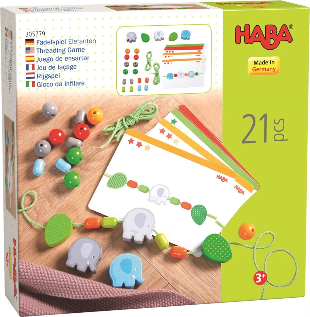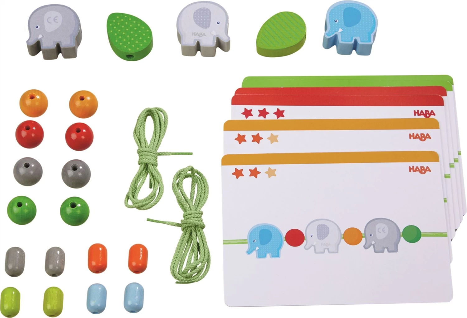 HABA Fädelspiel Elefanten. Die Tier-Karawane zieht weiter! Jetzt heißt es schnell sein: Wer ist der erste Elefant in der Reihe? Das entscheiden allein die kleinen Fäden-Zieher. Die Fädelsteine eignen sich zudem prima zum freien Spielen oder zum Fädeln nach Vorlage und sind auch perfekt für unterwegs.