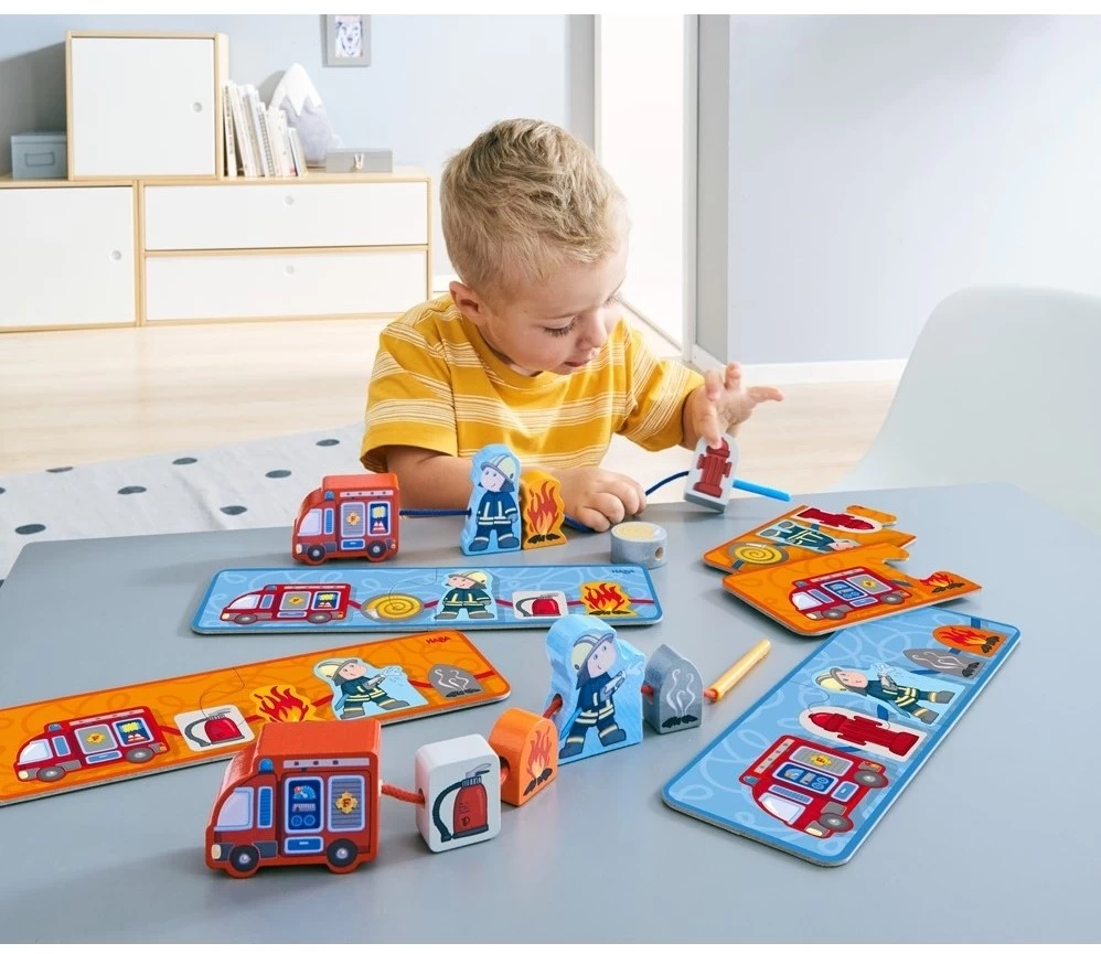 HABA Fädelspiel Feuerwehr. Fröhlicher Fädelspaß für kleine Feuerwehr-Fans. Die Fädelsteine eignen sich prima zum freien Spielen und sind auch perfekt für unterwegs.