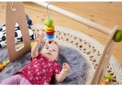 HABA Hängefigur Papagei. Der farbenfrohe Papagei lädt Babys zu einer spannenden Entdeckungstour ein. Sein Körper hat fünf bewegliche Holzscheiben und einen großen Holzring zum Greifen, Tasten und Fühlen. Berühren Babys das Glöckchen, fängt es lustig zu bimmeln an. Die Hängefigur ist dank praktischer Schlaufe überall leicht anzubringen und sorgt daheim sowie unterwegs für gute Laune.