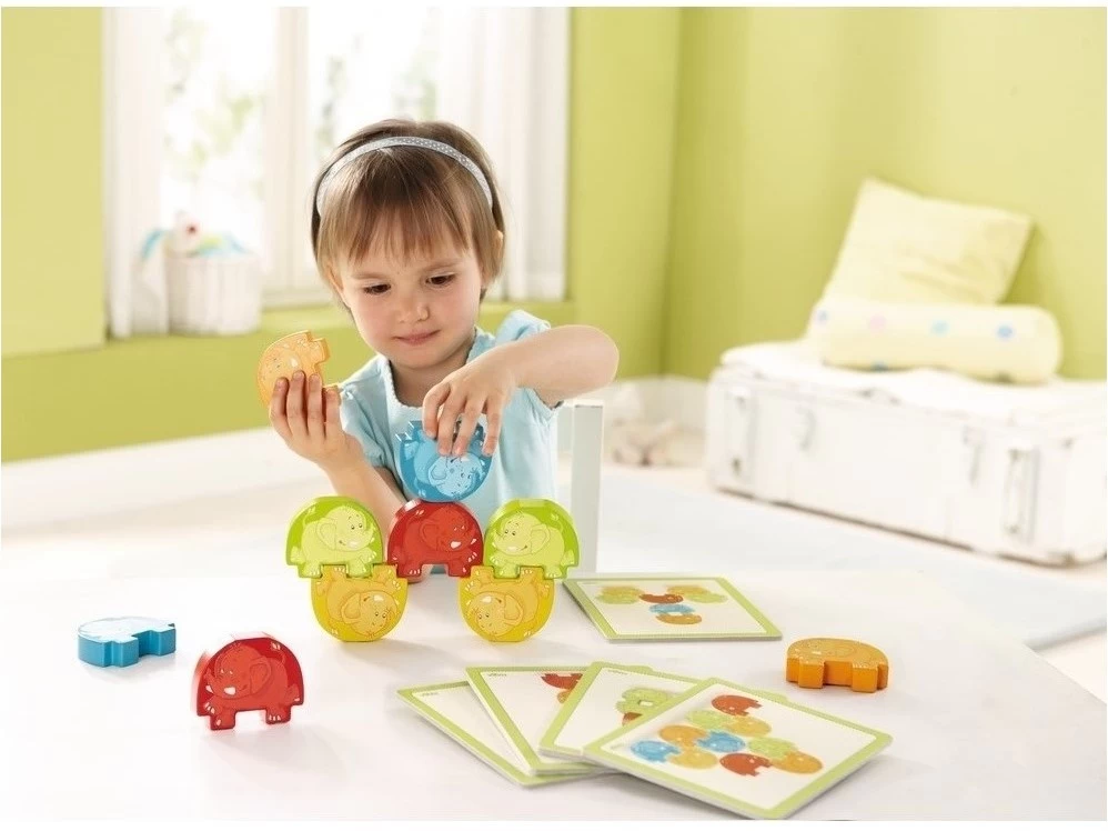 Ei, ei, ei – das ist eine wilde Wackelei. Die zehn bunten HABA-Wackelfanten lassen sich sehr lustig stapeln. Dabei gibt es viele Möglichkeiten und es bleiben auch gewagte Konstruktionen stehen, weil Beine, Körper und Rüssel ineinandergreifen. Aber die Kinder können nicht nur nach Lust und Laune ausprobieren und frei stapeln … auf fünf doppelseitig bedruckten Vorlagekarten finden sie unterschiedlich schwierige Aufgaben zum Nachbauen. Eine tolle Herausforderung für alle kleinen Stapelkünstler. Und wenn der Wackelfanten-Turm doch mal einstürzt, geht der ganze Spaß gleich wieder von vorne los.