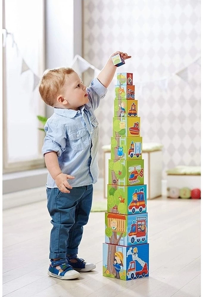 toller Spiel- und Stapelspaß mit 10 unterschiedlich großen Würfeln - liebevoll gestaltetes Stapelspiel mit vielen typischen Fahrzeuge und Tätigkeiten der Feuerwehr