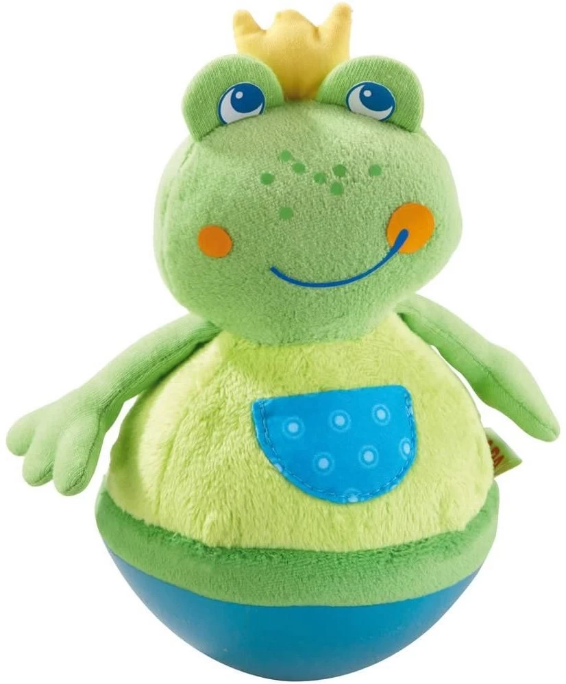Wenn Babys zu krabbeln beginnen, öffnet sich für sie eine neue Welt wenige Zentimeter über dem Boden – und altersgerechtes Spielzeugt trägt dem Rechnung. Wenn die Kleinen die HABA-Stehauffigur Frosch anstupsen, bewegt sie sich schnell hin und her, kreiselt und kullert ein kleines Stück weiter und steht dann fröhlich nickend da. Dazu klingelt die Stehauffigur – übrigens bewusst nicht so laut, damit die empfindlichen, kleinen Öhrchen geschützt werden. Das macht allen Babys riesigen Spaß und trainiert zudem ihre Motorik. Denn egal, wohin die Stehauffigur Frosch auch hinkullert, das Baby muss hinterher!