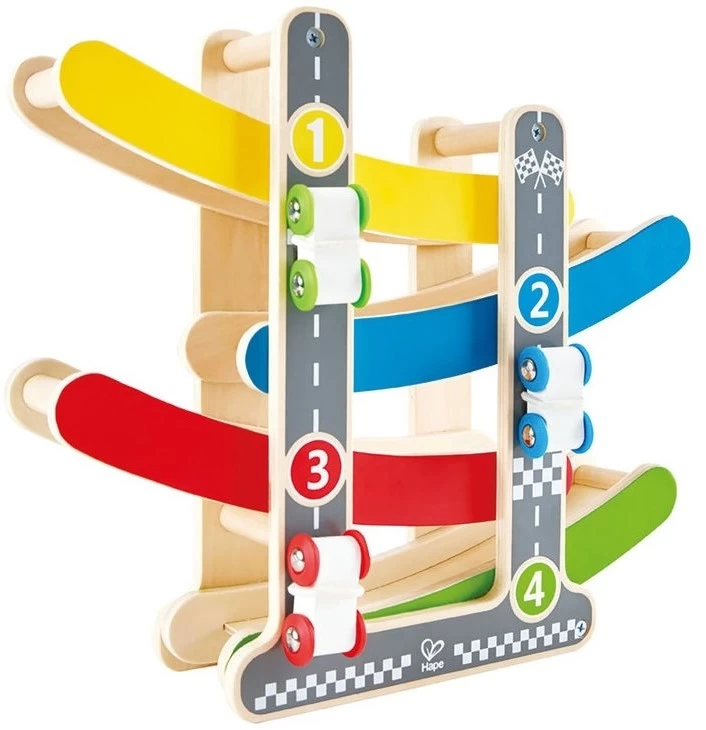 Hape E0438 Flickflack-Rennbahn, inkl. DREI Autos, Autorennbahn aus Holz, ab 18 Monate