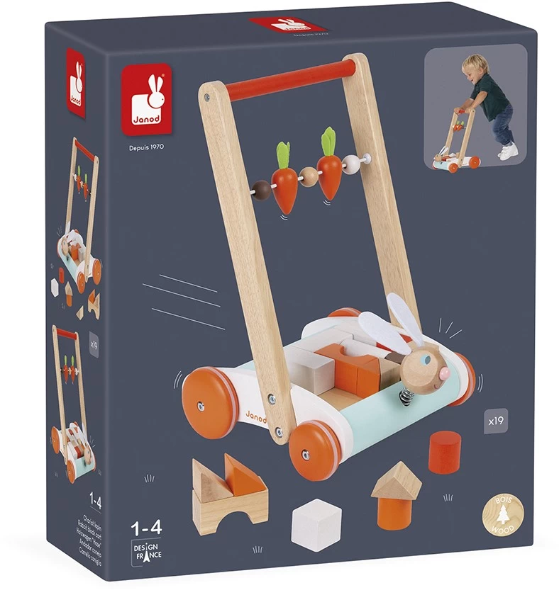Janod Holzwagen Hase-Holz Lauflernwagen-Wackelnder Hasenkopf auf Feder, Karotten Abakus-Mit 19 Holzbausteinen-Kinderspielzeug-Ab 1 Jahr, J08251