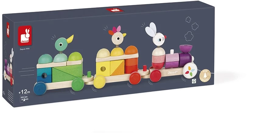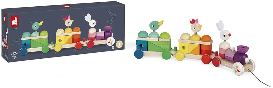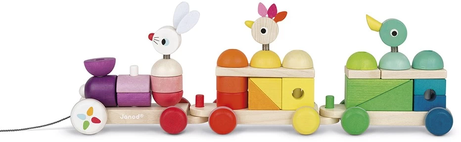 Holzspielzeug. Nachziehzug aus Holz, groß. Mit vielen Formen und Bauklötzen für kreatives Gestalten und Lernen. Mit Gummizug im Inneren der Stäbe für Sicherheit, die Stäbe geben nach und sind flexibel. 2-in-1-Spielzeug: , Ziehspielzeug zur Entwicklung von Babys Motorik , zahlreiche Klötze zum Stapeln, um Formen und Farben zu lernen Holz: Buche und Kirschbaum. Leise Räder dank rutschfestem Kautschuk. Länge der Schnur: 50 cm. Wasserfarben. FSC ®-zertifiziert.