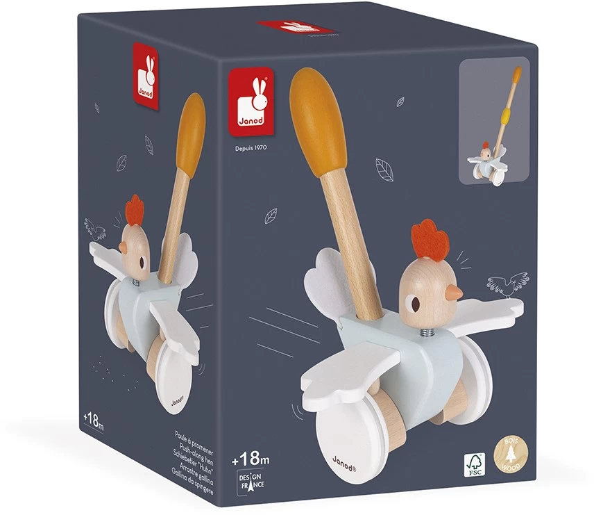 Janod J08260 Schiebespielzeug aus Holz „Huhn“ -Baby-und Kleinkindspielzeug-Entwicklung von Motorik und Fantasie-Leise Räder-FSC-Zertifiziert-Ab 18 Monaten