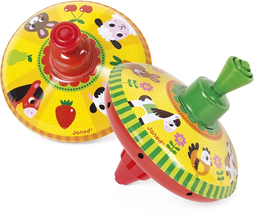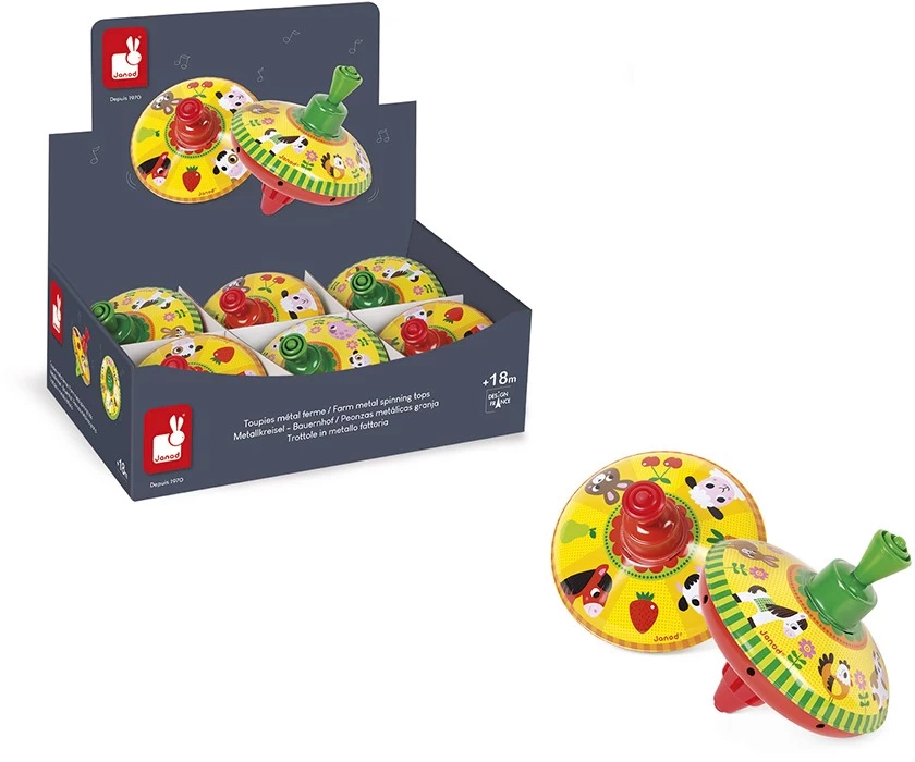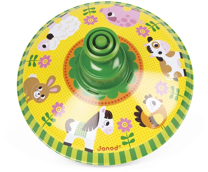 Klassischer Kreisel aus Metall. Geeignet für Kinder von 18-36 Monaten. Mit Motiven aus der Welt des Bauernhofes gestaltet (zwei unterschiedliche Motive erhältlich, Zufallsmuster). Drehspitze jeweils in rot oder grün. Beim Drehen erklingt eine Melodie. Größe ca. 13 x 13 x 14 cm.