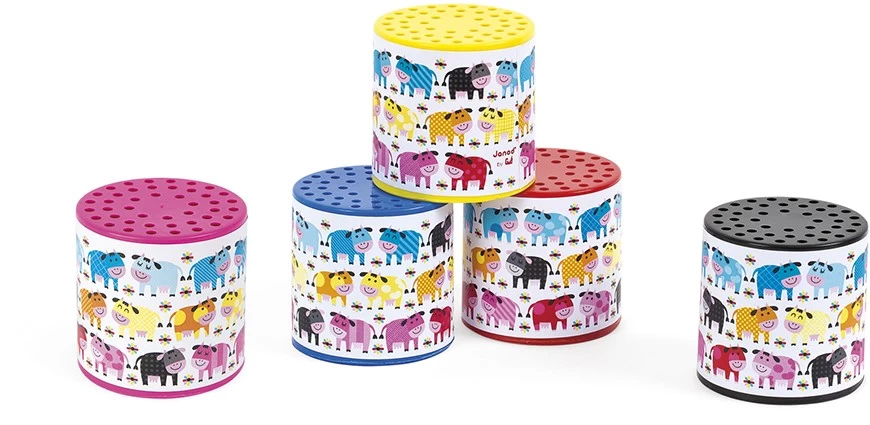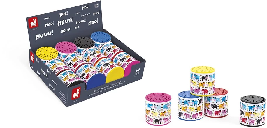 Klassischer Noisemaker. Aus Kunststoff. In unterschiedlichen Farben erhältlich. Größe 6 x 6 x 6 cm. Beim Schütteln ertönen Kuhgeräusche. Geeignet für Kinder von 2-5 Jahren. Zufallsmuster.