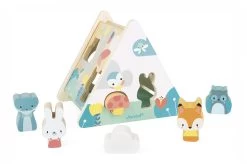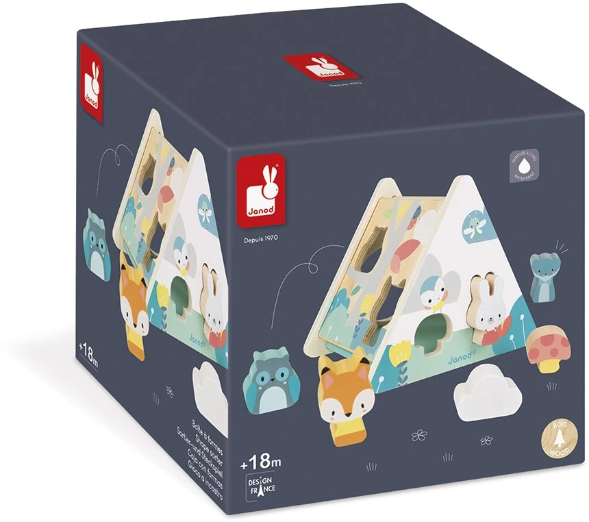 Eine hübsche Sortierschachtel aus Holz in zarten und hochaktuellen Farbtönen mit niedlichen Tieren. Die sechs Formen, die in das Zelt gesteckt werden sollen, helfen den ganz Kleinen, ihre Geschicklichkeit auf spielerische Weise zu entwickeln.