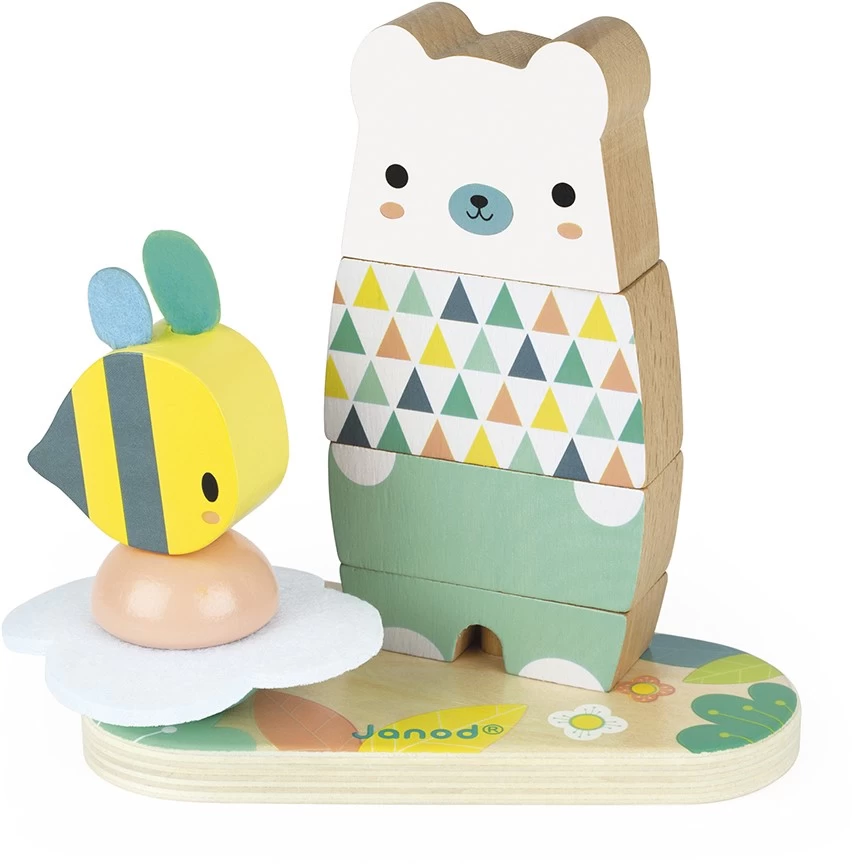 Hübsches Stapelspiel 2 in 1 in angenehmen zeitgemäßen Farben mit putzigen Tieren: einem Bären auf der einen Seite und einem Panda auf der anderen! Es wird Ihrem Kind viel Spaß bereiten, die Tiere zusammenzusetzen und ihre Kleidung zu vertauschen. Auch die kleine Biene auf ihrer Blume lässt sich stapeln!