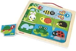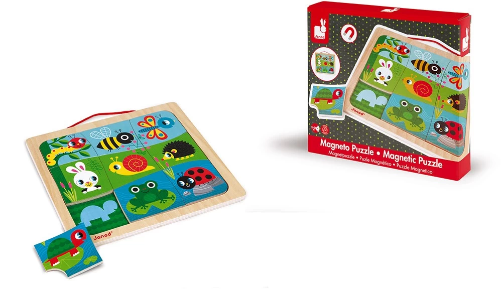Puzzle- und Assoziationsspiel aus Holz für Kinder von 18 bis 36 Monate. 9 Teile. Farbenfrohes Garten-Motiv. Anhand der Umrisse sollen die 9 Puzzleteile zugeordnet werden. Ordne das Tiermotiv seinen Umrissen zu. Die Spielsteine sind einfach zu kombinieren bzw. zu legen dank der Magneten. Praktischer Tragegriff für leichten Transport.