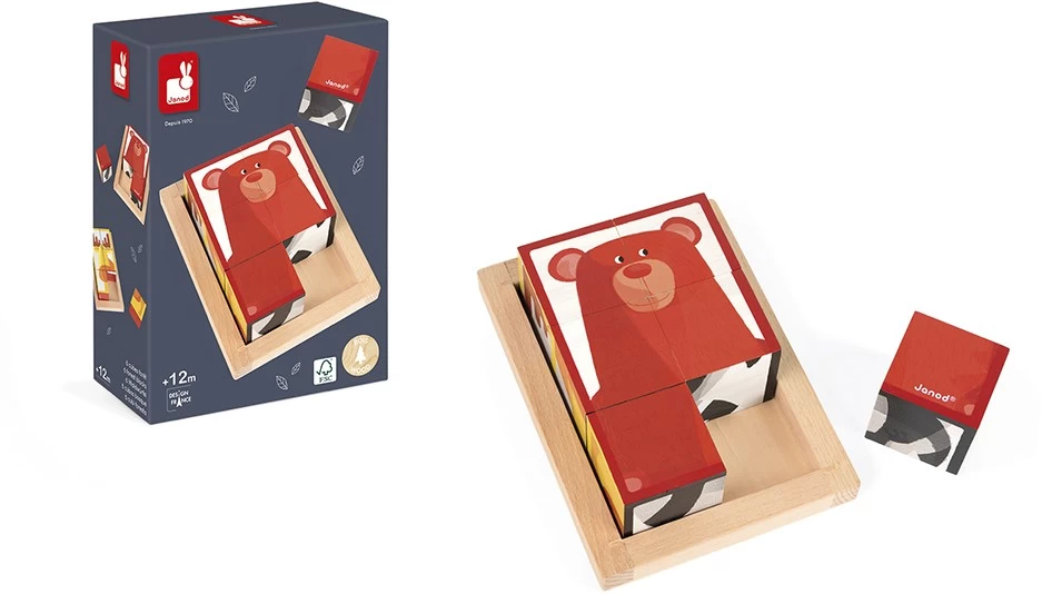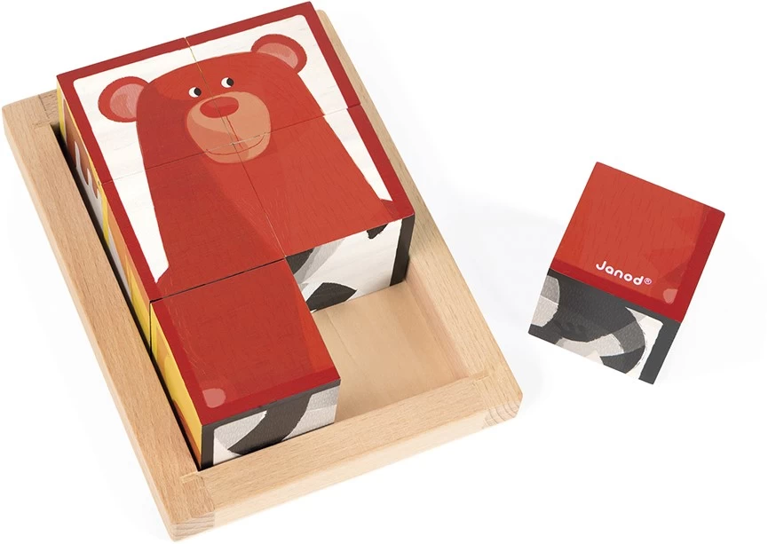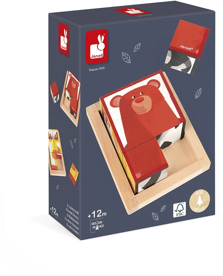Holzspielzeug. Für Kinder von 12 bis 36 Monate. Diese Motiv-Bausteine bzw. Spielsatz besteht aus 6 massiven Holzwürfeln. FSC-zertifiziertes Holz. Der Spielsatz fördert die Entwicklung der Koordination und der Beobachtungsgabe Ihres Kindes. Die sechs Bilder in zarten Farben mit Tierportraits (Fuchs, Eule, Kaninchen, Waschbär, Bär, Elch) unterstützen die Vorstellungskraft sowie das visuelle Gedächtnis Ihres Kindes. Ein hochwertig verarbeitetes Spielzeug mit hohem Lernwert und Spielnutzen.