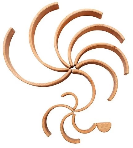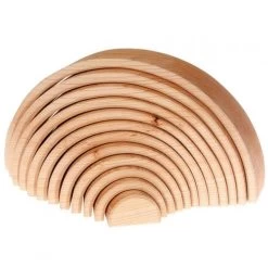 Die Kleinen stapeln, bauen und sortieren. Wenn die Kinder älter sind kann man mit den Bögen Puppen wiegen, Zäune, Tunnel, Brücken, Häuschen und Skulpturen bauen, und und und… der große Regenbogen wird immer fantasievoll ins Spielen integriert sein, schauen Sie zu was Ihr Kind alles damit erfindet!