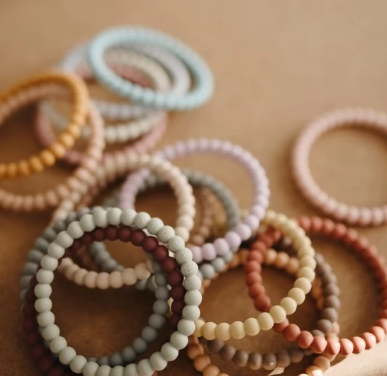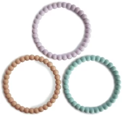 MUSHIE – SILIKONARMBÄNDER (3er-Pack) lila/cyan/soft peach {#}{#}Mushie Beißspielzeug Perlenarmbänder in Pastelltönen. Set mit 3 Armbändern zum Zahnen, um Ihrem Baby das Zahnen zu erleichtern {#}Mushie Zahnungsarmbänder können ab dem Zahnen verwendet werden {#}Die Armbänder haben eine gerippte Textur, ideal zum Draufbeißen, wenn die Zähne Ihres Kindes durchbrechen. Die Armbänder haben einen Durchmesser von 8 cm und ein Innenmaß von 6,5 cm.