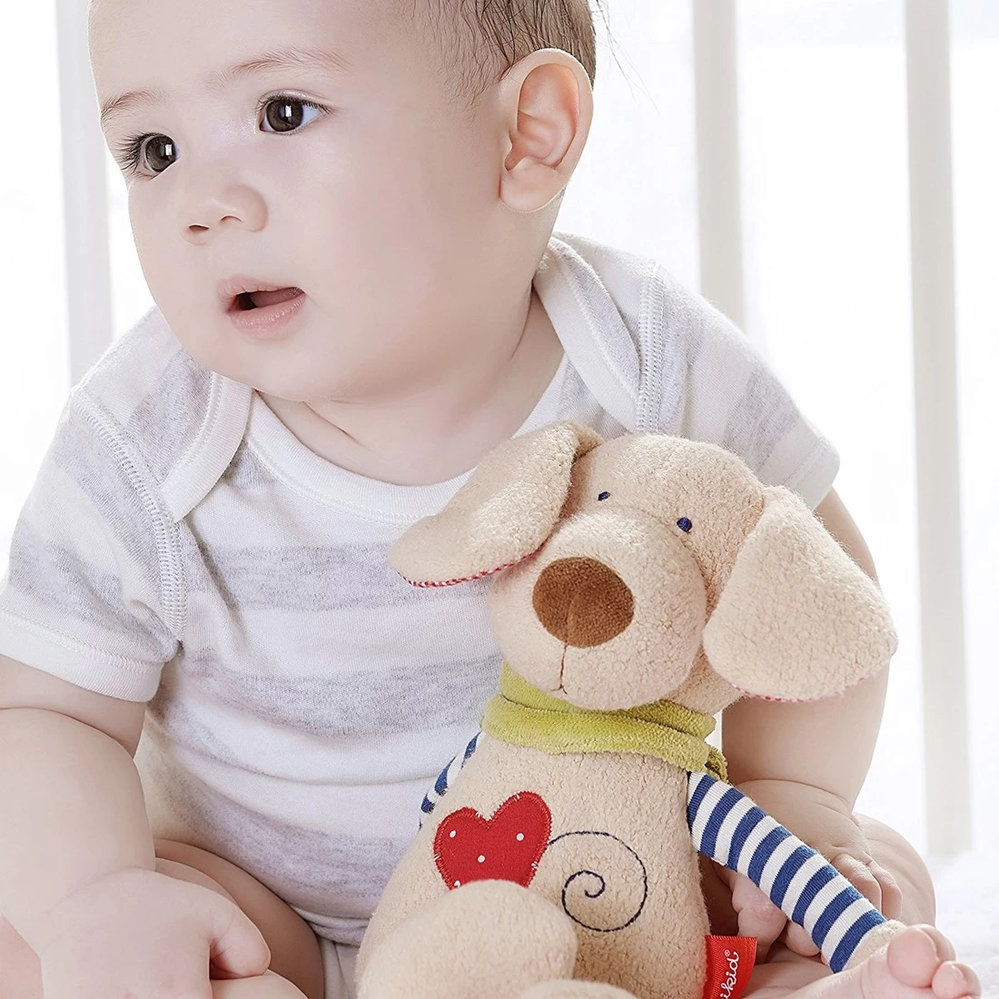 Kuschel mich und ich spiel Dir ein Leid. Der süße Musikhund bereichert Babys Alltag und ist auch nachts ein gern gesehener Schmusefreund im Bettchen. Tolle Plus: Die verwendeten Materialien sind aus 100% kbA-Baumwolle. Inkl. Spielwerk, dass zum Waschen oder zum Einsetzen einer neuen Melodie entnommen werden kann.
