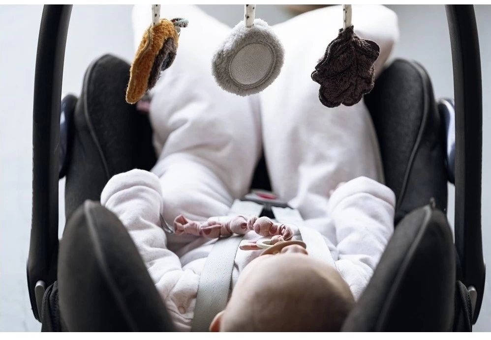 Kinderwagenspielzeug – elegantes, stilvolles und verspieltes Spiel-zeug für den Kinderwagen in warmen, ruhigen Farben. Schön zu spielen, zu berühren, zu ziehen, zu kneifen oder zu beobachten. Mit einer süssen Glocke, einem kleinen Spiegel und natürlich dem Snoozebaby-Etikett, das endlose Stunden Spaß bietet und gleichzeitig die Feinmotorik und den Tastsinn anregt. Hergestellt in der Türkei aus 100% Oekotex und Interlock. Größe 47 (inkl. Knoten)
