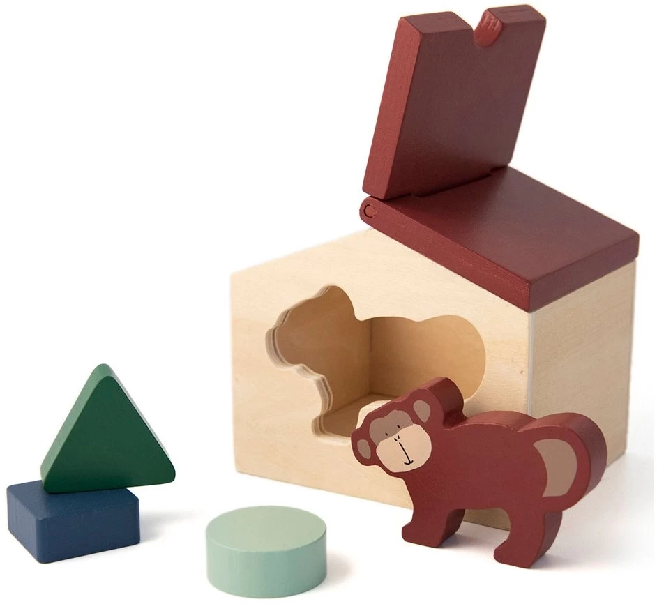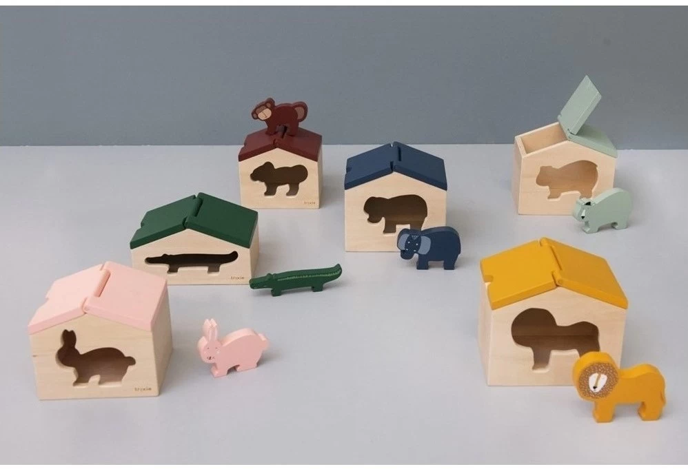 Alle tierischen Freunde winken aus ihrem kleinen Holzhaus! Jedes Haus wird mit einem Tier und 3 geometrischen Klötzen geliefert. Diese niedlichen Häuser versprechen phantasiereiches Spielvergnügen. Das Dach lässt sich öffnen und das Haus mit dem Tier oder mit den Klötzen füllen. Das ideale Spielzeug, um die Phantasie Ihres Kindes zu beflügeln.