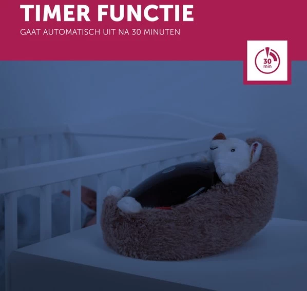 Deze projector helpt bij het in slaap laten vallen van uw kind door middel van een animatie in drie stappen. Na 30 minuten zal de projector automatisch uitgeschakeld worden.