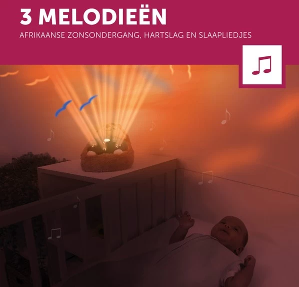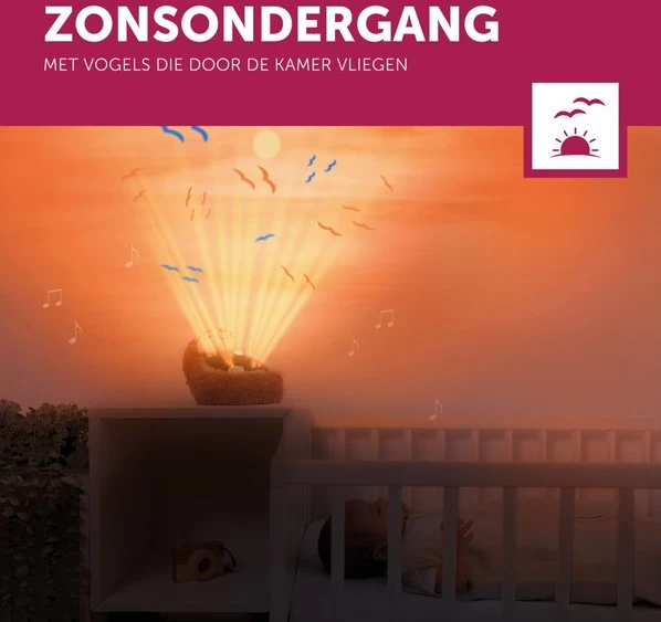 De projector projecteert een magische zonsondergang met vogels die vliegen door de hele kamer. Het zachte oranje licht helpt bij de aanmaak van melatonine, het slaaphormoon.