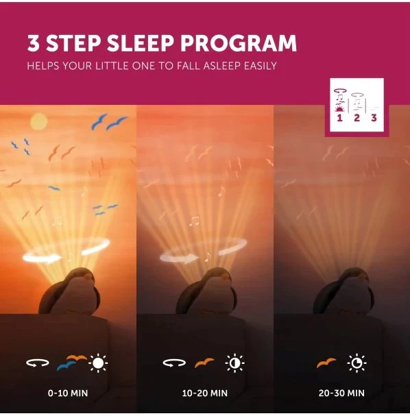 Deze projector helpt bij het in slaap laten vallen van uw kind door middel van een animatie in drie stappen. Na 30 minuten zal de projector automatisch uitgeschakeld worden.